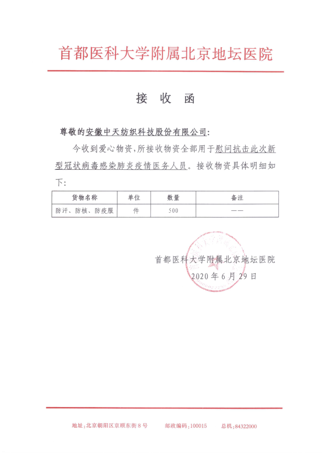 自6月11日,北京突發(fā)疫情反彈進(jìn)入防疫戰(zhàn)時(shí)狀態(tài)后,安徽中天紡織科技股份有限公司向首都醫(yī)科大學(xué)附屬北京地壇醫(yī)院捐贈了500件防汗、防核、防疫服,用于慰問抗擊此次新型冠狀病毒肺炎疫情的醫(yī)務(wù)人員。首都醫(yī)科大學(xué)附屬北京地壇醫(yī)院作為北京目前獨(dú)家承擔(dān)收治任務(wù)的醫(yī)院,各部門有序應(yīng)對,再一次體現(xiàn)了地壇速度。